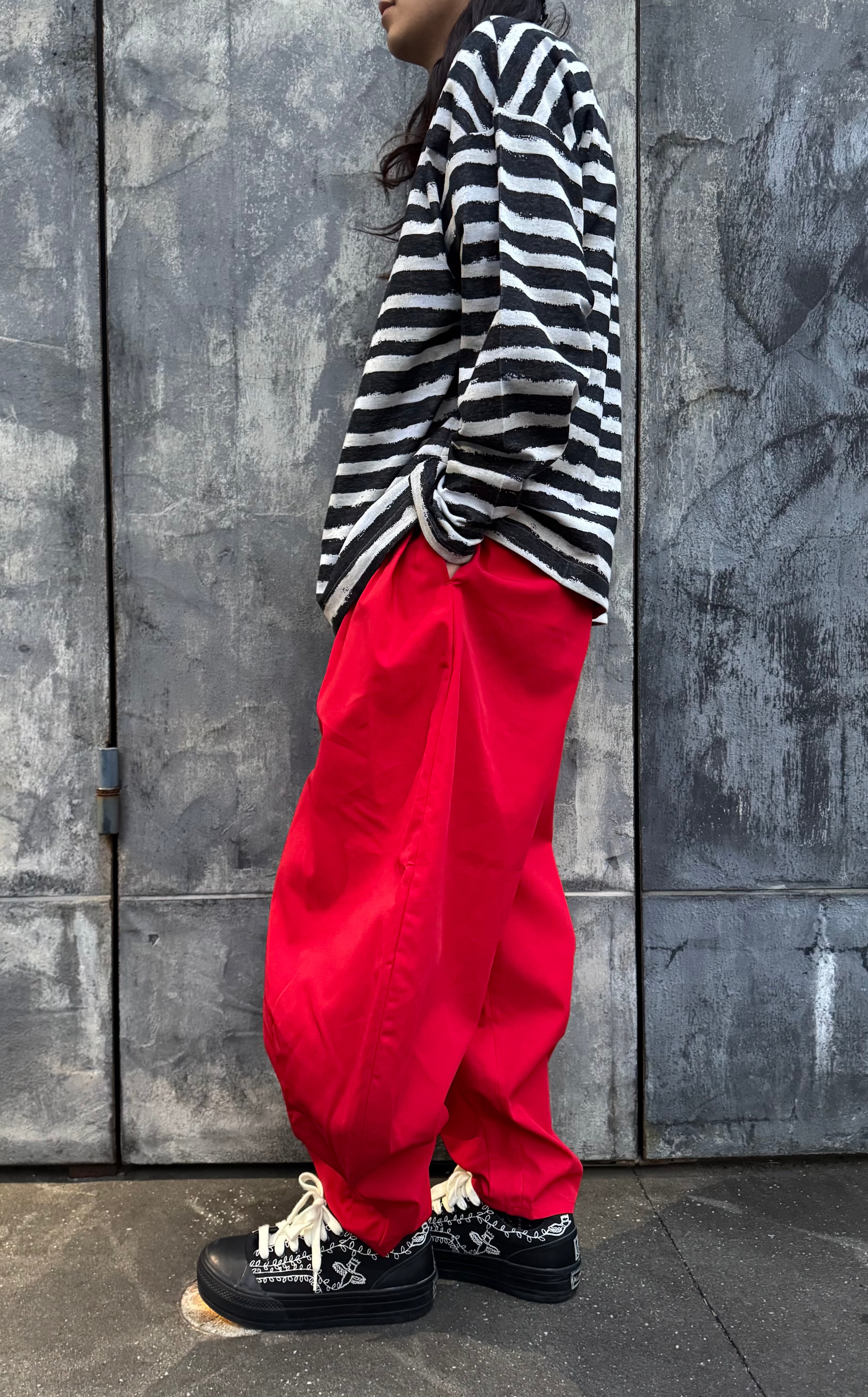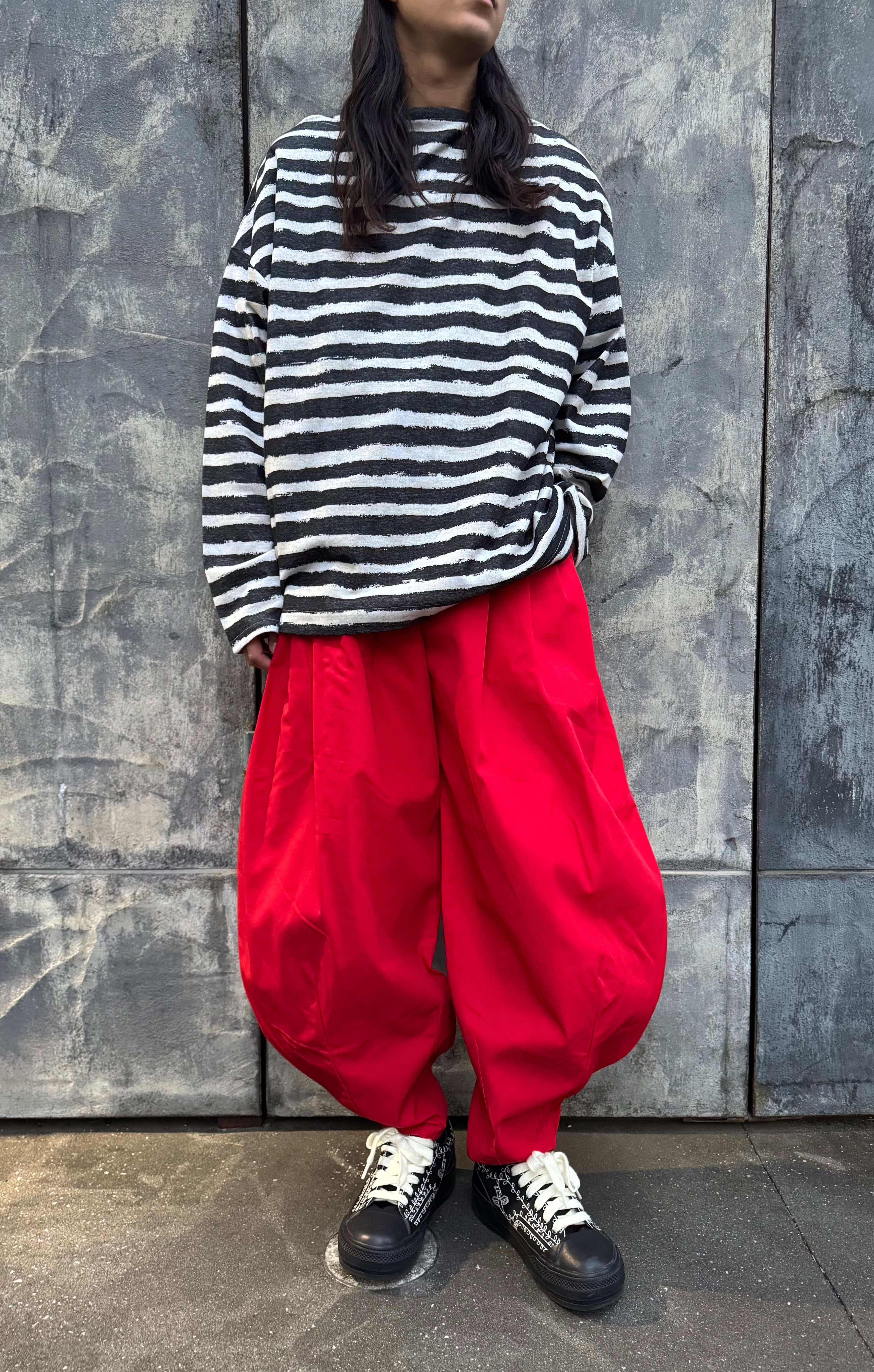 Designed with inspiration from Euro-vintage Zouave pants, these trousers are characterized by their distinct volume. With four tucks at the waist and a narrow leg opening, the design allows the fabric to pool stylishly at the ankles.