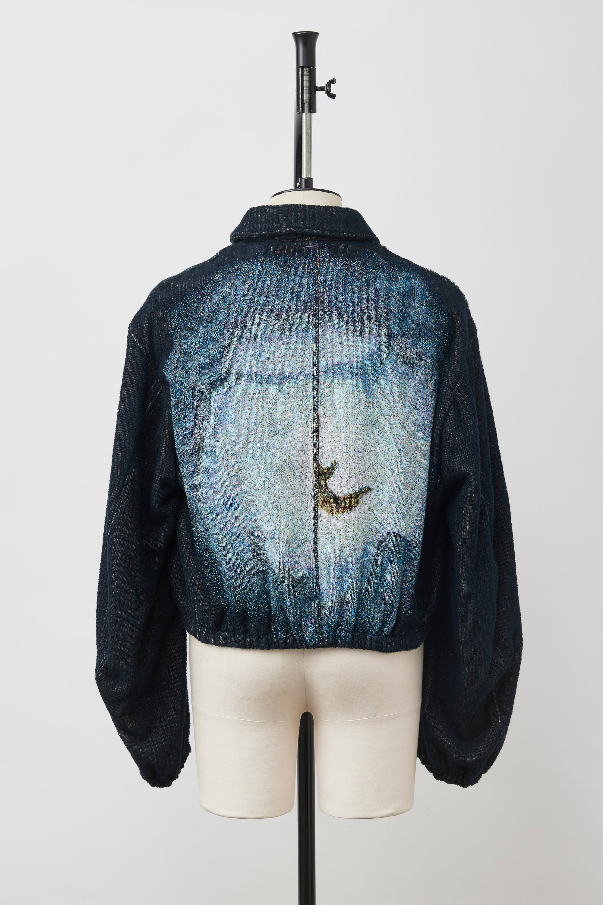 A front-zip jacket featuring voluminous sleeves inspired by the traditional Japanese Kappogi (apron). With elasticated cuffs, the sleeves can be styled to create a distinct draped effect.