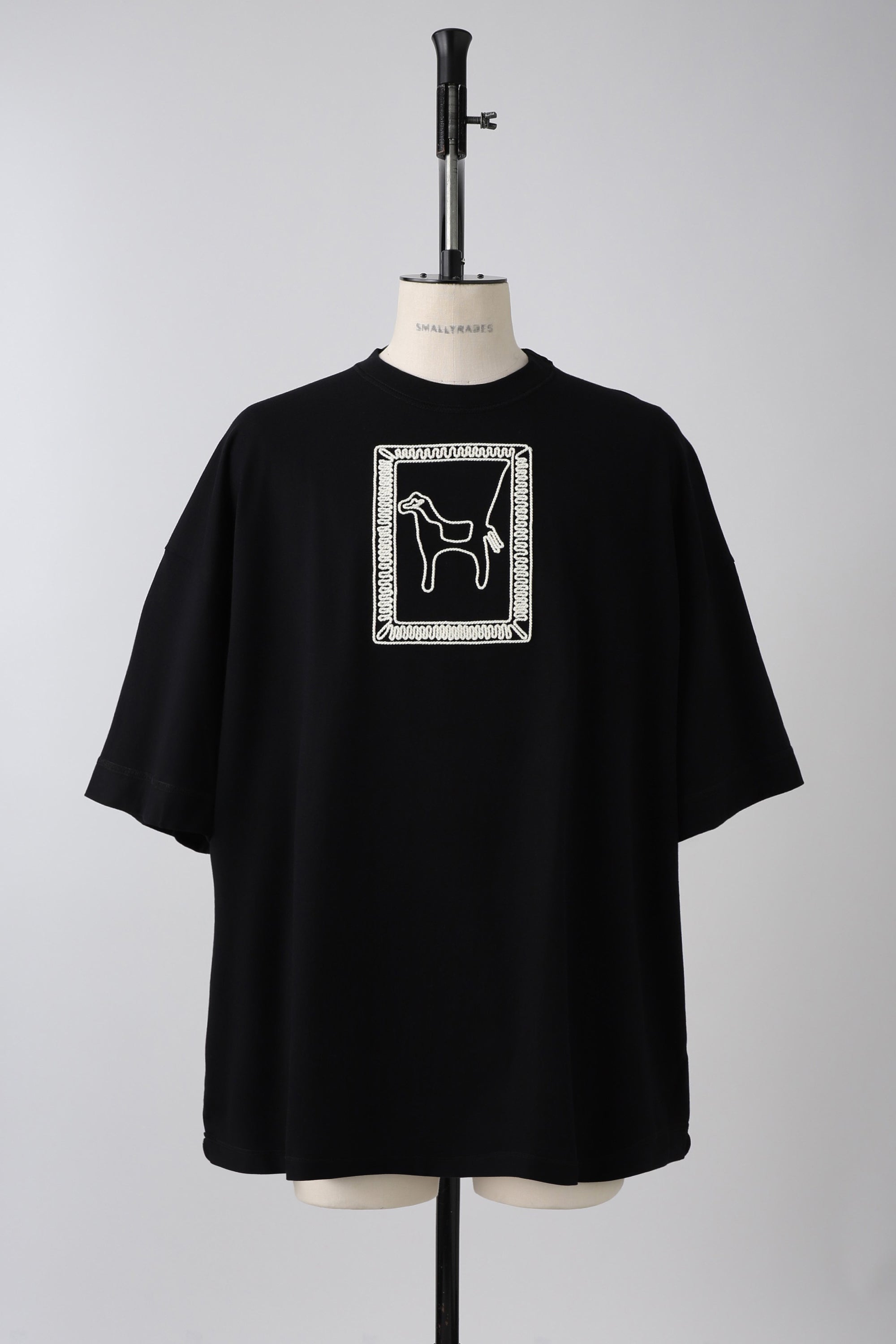 The garment features "rope embroidery"—a continuous, single-stroke technique—to depict a horse framed within a border.