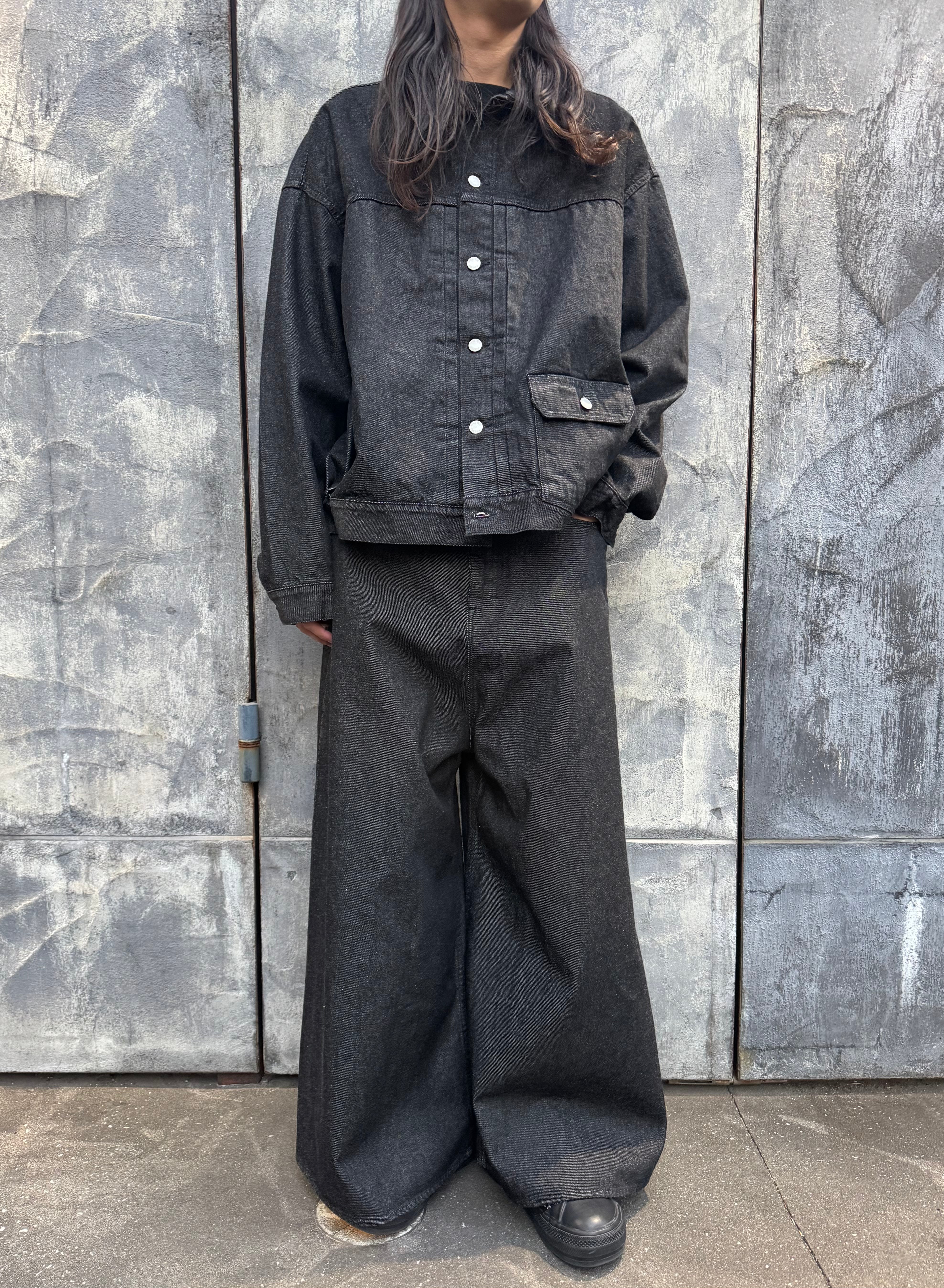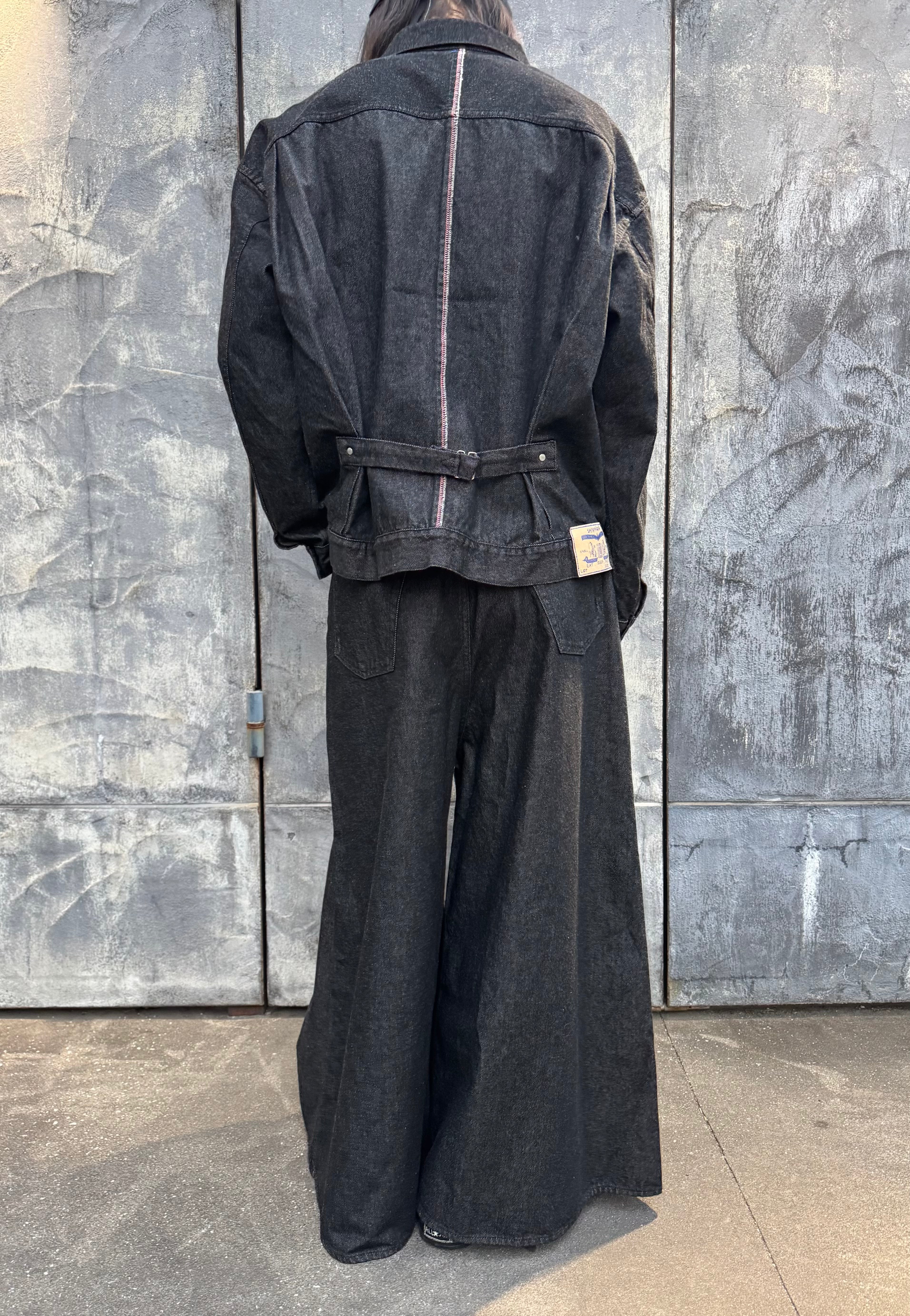 These denim pants feature a bold leg opening that creates a dramatic, skirt-like flare. The design is characterized by its deep rise and a unique, tubular silhouette.